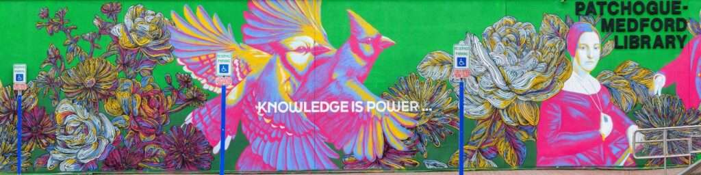 “Th[e] mural [is] ‘KNOWLEDGE IS POWER.’ It celebrates the Patchogue-Medford Library as a place where stories spark imagination and connect community. At its center, four children of diverse backgrounds gather around an open book, their shared reading blossoming into a vivid scene that blends local history with the natural beauty of New York. A white-tailed deer, northern cardinal, and blue jay emerge alongside a rose and New York aster, symbolizing growth, harmony, and the richness of the region’s flora and fauna. The design also honors the library’s legacy, from its Carnegie origins to the contributions of Elizabeth Oakes Smith, a local author and early women’s rights activist. By weaving these historic roots into a playful, nature-inspired vision, the mural invites adults, children and families to see reading as both a journey and a bridge—linking past to present, individual to community, and imagination to knowledge.”